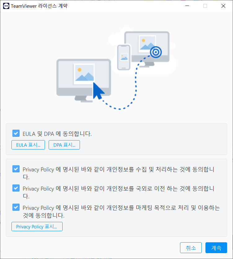 다운로드한 파일을 실행하여 팀뷰어 설치 프로세스 진행
